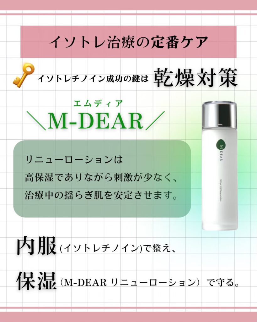 イソトレチノインの副作用で最も多いのが「肌の乾燥」です。当院では、薬だけを渡して終わりではありません。 高保湿ドクターズコスメ「M-DEAR(エムディア)リニューローション」をセットにすることで、治療中のバリア機能低下を防ぎ、ダウンタイムを最小限に抑えます。
